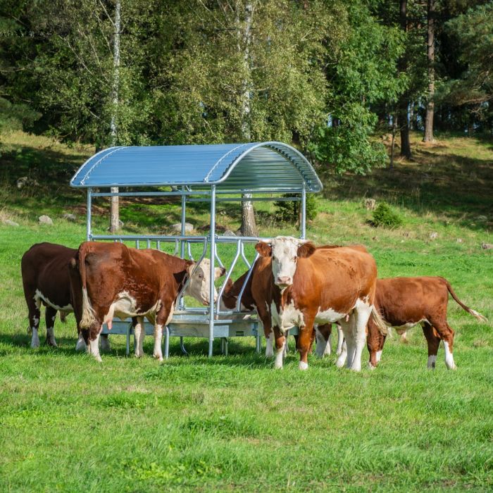 En robust diagonalfront med 42 mm rör och 437 mm cc per foderplats. Detta gör den extra stark utan rörliga delar för utfodring. Alla sidor är öppningsbara som gör det enkelt att fylla på med foder. Taket är justerbart i höjd och ger bra skydd åt fodret så det håller sig fräschare längre. Taket är försett med skyddsbåge runt hela takets kant så djuren inte skadar sig. Foderhäcken står stadigt på tre fotbågar och har tilhörande pallgaffelfästen för att enkelt kunna flyttas. Med en foderhäck minskar du foderspillet, höjer hygienfaktorn och mängden ratat foder minskar.